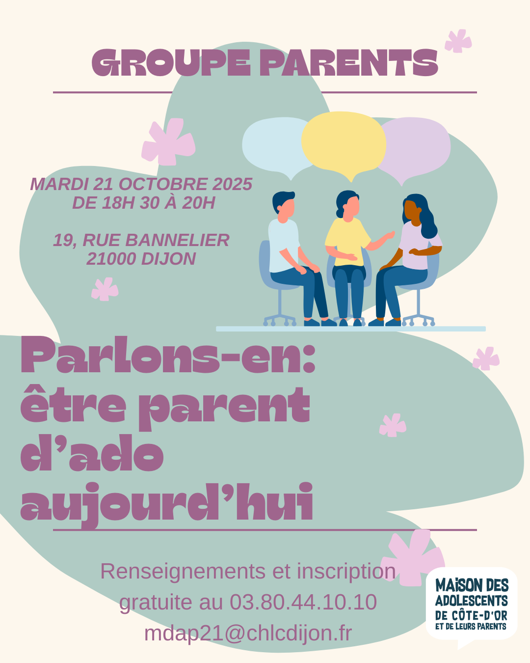 Les parents ou les proches d’adolescents, premiers acteurs impliqués dans l’éducation ou la santé des jeunes, vous faites l’objet d’une attention particulière à la MDAP. Cette structure peut vous permettre d’échanger, de partager vos angoisses, vos doutes… de mettre des mots sur vos difficultés à être parent par moment.