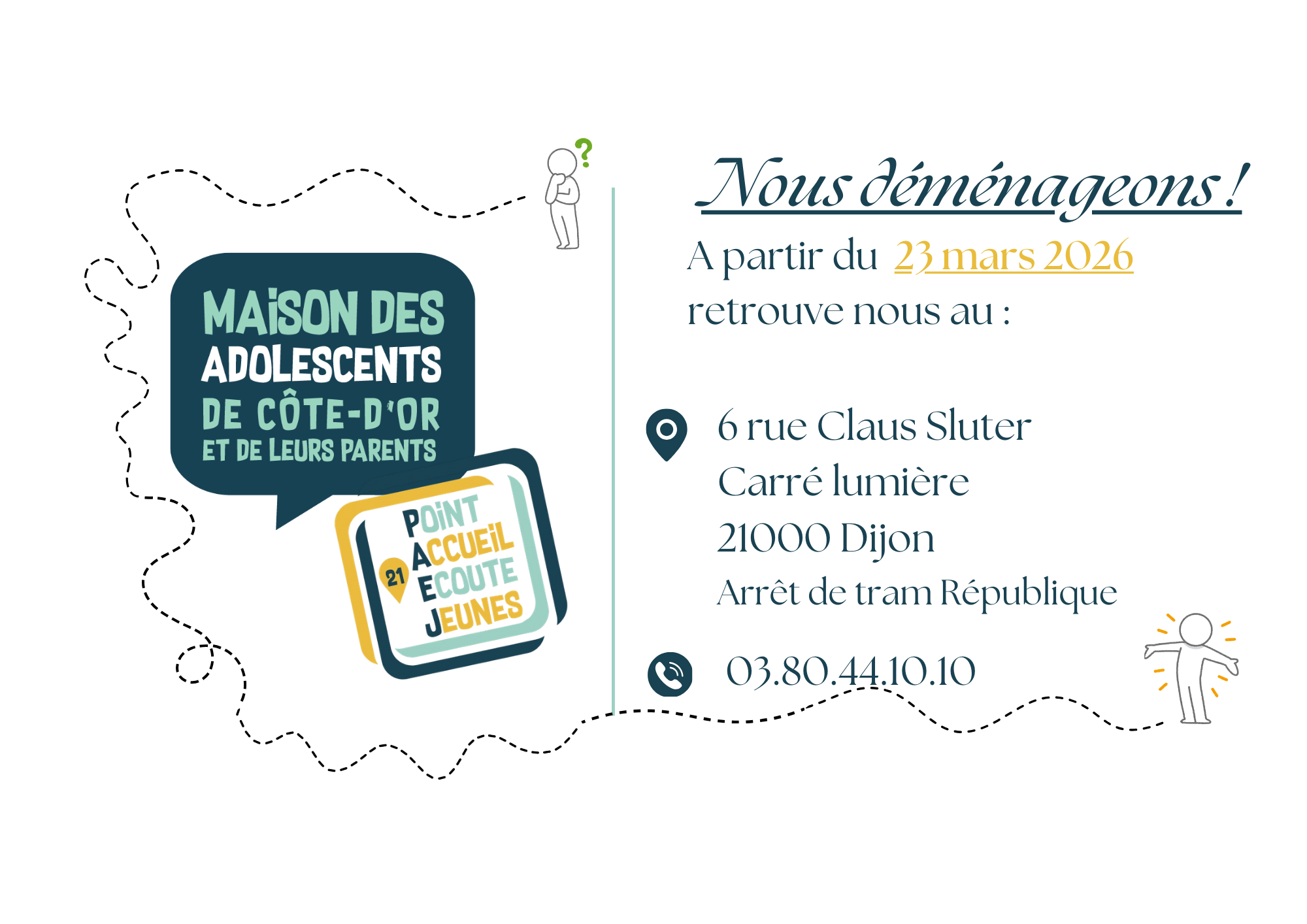 - Sur tout le département de Côte-d’Or, la MDAP21 propose des lieux d’accueil, d’écoute, d’accompagnement et d’orientation pour des jeunes (11/25ans) en questionnement ou mal être de tout ordre: familial, social, scolaire, universitaire, amical, sentimental, sexuel, médical…