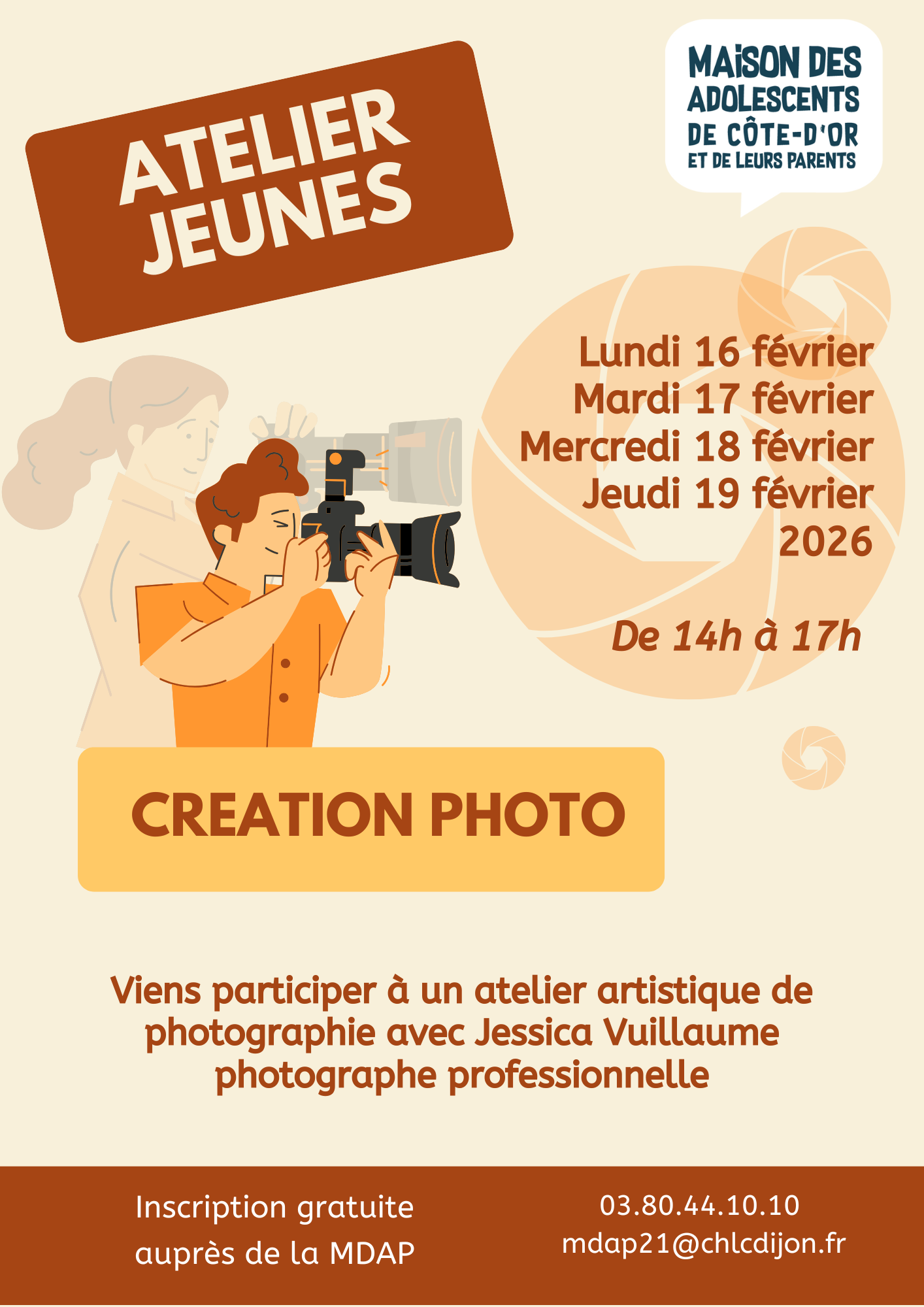 On continue les ateliers, mais on change de style ! On va faire de la Création Photo avec l’aide d’une photographe professionnelle. Cet atelier se passe sur 4 jours : lundi 16 février, mardi 17 février, mercredi 18 février et le jeudi 19 février 2026 (c’est la deuxième semaine des vacances scolaires). De 14h à 17h les quatres jour