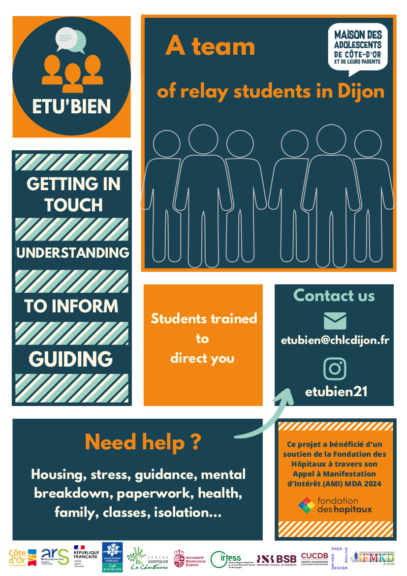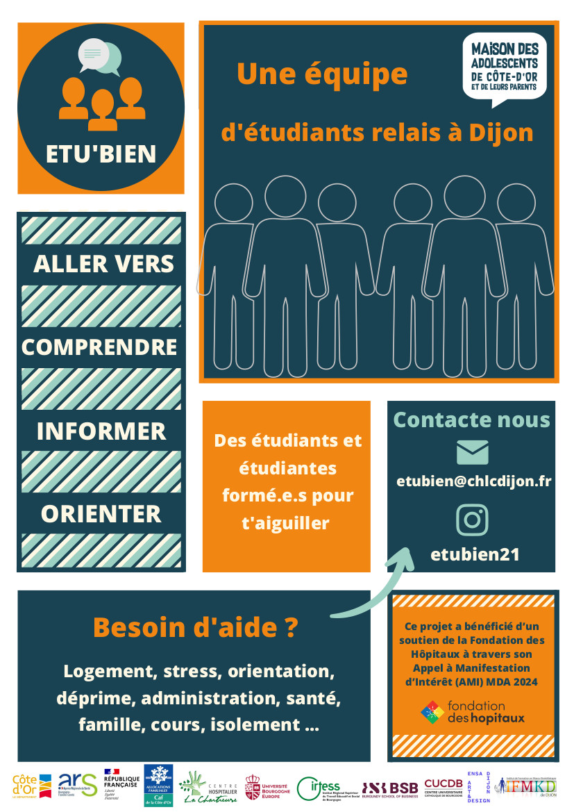 Initié par la Maison des Adolescents de Côte d’Or et de leurs parents (MDAP21), le projet Étu’Bien s’inscrit dans une démarche de prévention primaire à destination d’étudiants confrontés à des difficultés diverses au moment de leur arrivée dans les études supérieures. et/ou dans leur vie de jeunes adultes.