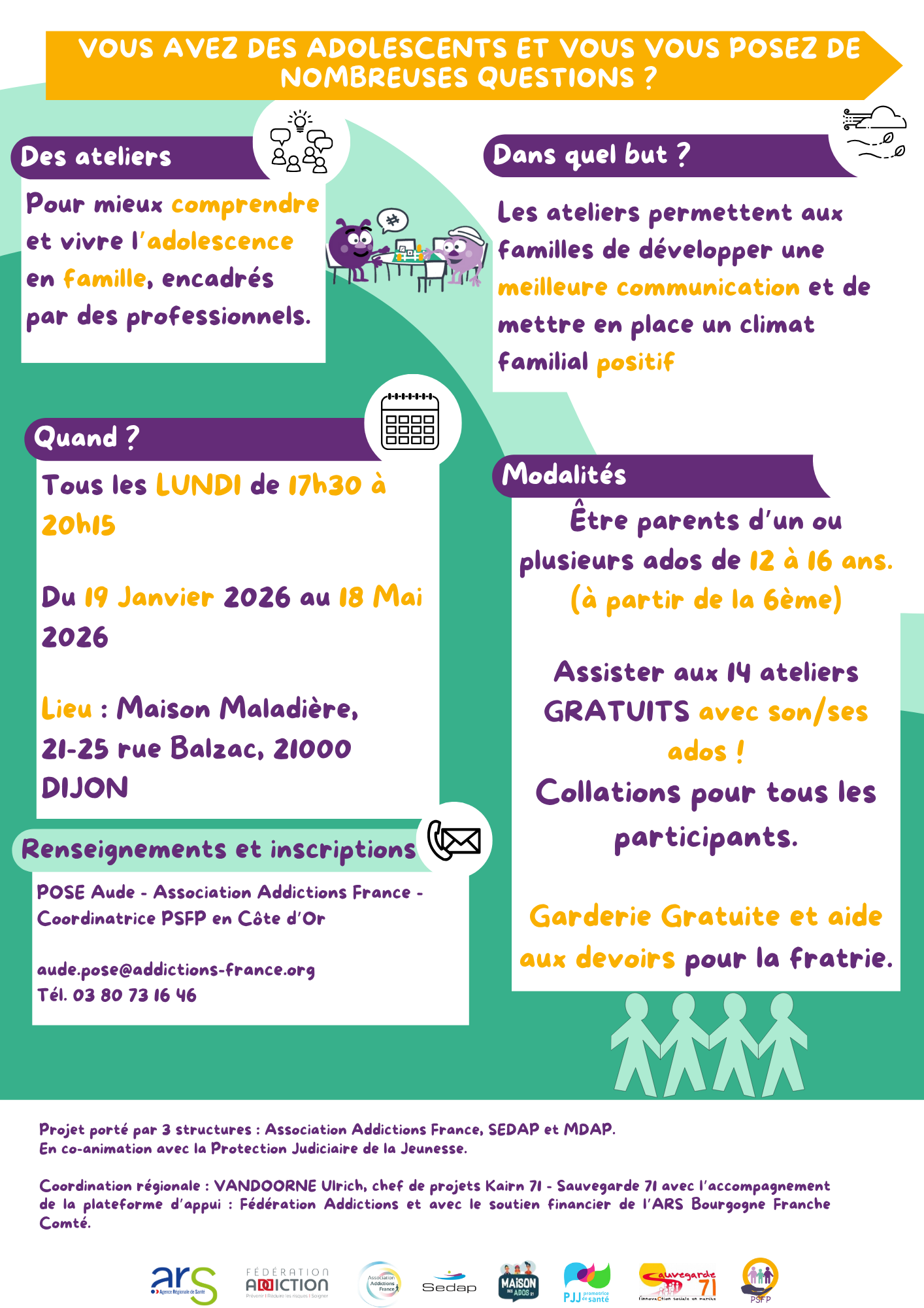 La Maison des Ados s’associe à la SEDAP, Addictions France et à la Protection Judiciaire de la Jeunesse pour co-animer le Programme de Soutien aux Familles et à la Parentalité à Dijon pendant le premier semestre 2026.